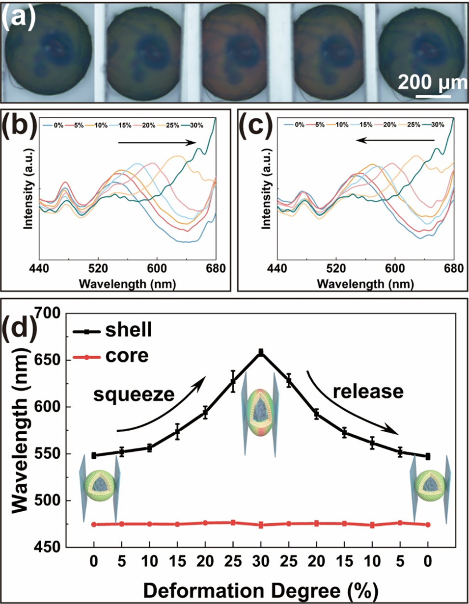 图7. 微胶囊在压缩-恢复过程中的光学响应:(a) 不同变形程度下微胶囊的光学显微镜图像(比例尺:200μm);(b) 微胶囊受压过程中的反射光谱;(c) 微胶囊卸压过程中的反射光谱;(d) 微胶囊壳层(黑色)和核层(红色)的反射波长随变形程度的变化规律(变形程度从0%增至30%,再从30%降至0%),误差棒代表五次重复测量的标准偏差