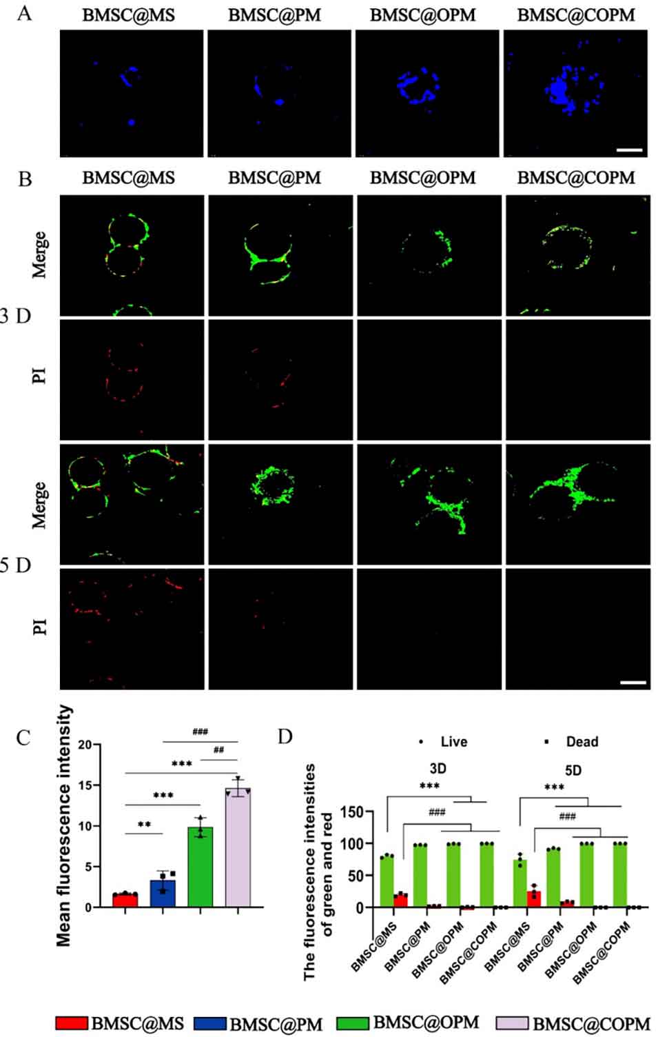 图3 骨髓间充质干细胞(BMSCs)在开放多孔微球上的黏附与存活情况