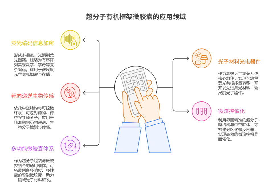5、该研究建立了界面导向的SOF组装方法,融合超分子化学、微流控技术与光捕获功能,为限域光子材料和多功能微胶囊体系的发展开辟了新途径,在光子器件、光学信息存储、能量转移材料等领域具有广阔应用前景。