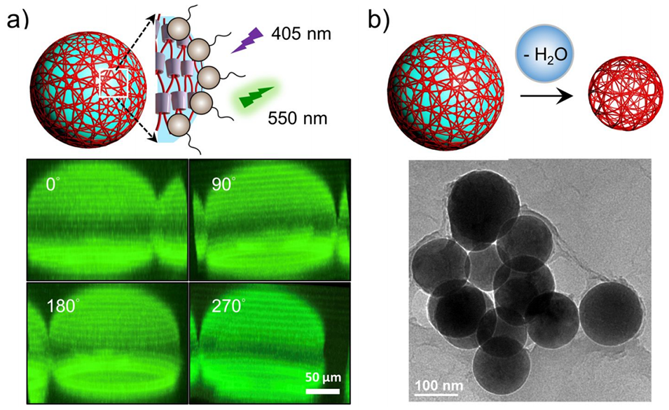 图3. (a) 微液滴的结构示意图及代表性单个微液滴的激光扫描共聚焦显微镜三维重构图像;(b) 采用含20 wt%全氟辛醇的FC-40破乳后,微液滴的结构示意图及透射电子显微镜图像。