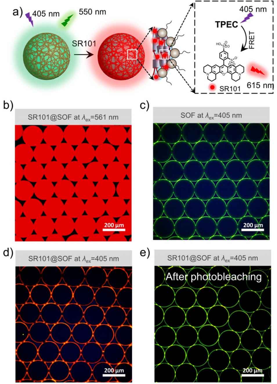 图5. (a) 包封SR101后,微胶囊内荧光共振能量转移的过程示意图;(b) 561 nm激发下,含SOF的微胶囊荧光显微镜图像;(c) 405 nm激发下,未包封SR101的SOF微胶囊荧光显微镜图像;(d) 405 nm 激发下,包封SR101的SOF微胶囊荧光显微镜图像;(e) 经405 nm激光照射10分钟后,405 nm激发下的SOF-SR101复合微胶囊荧光显微镜图像。