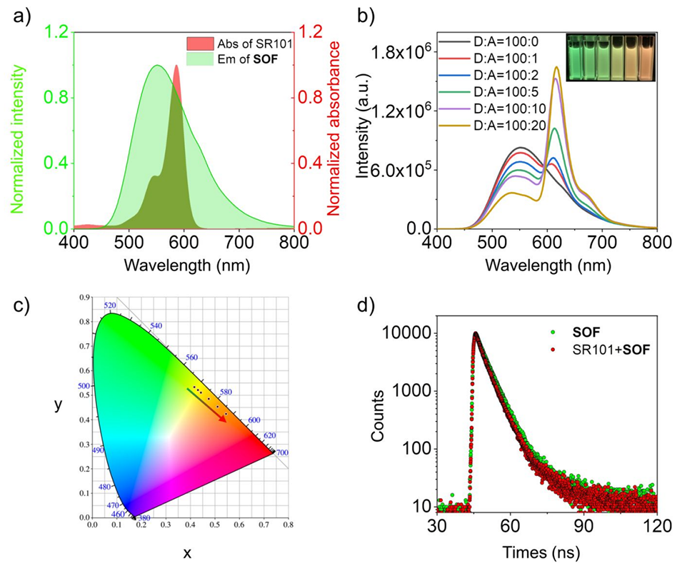 3、基于该限域结构,将界面SOF作为能量供体,包封磺基罗丹明101(SR101)作为受体,构建了人工集光体系,通过高效的荧光共振能量转移(FRET)实现了57.5%的高能量转移效率和可编程荧光输出;利用SR101的光漂白特性,还能实现荧光状态的光调制,得到黄绿光、红光等不同发射模式。