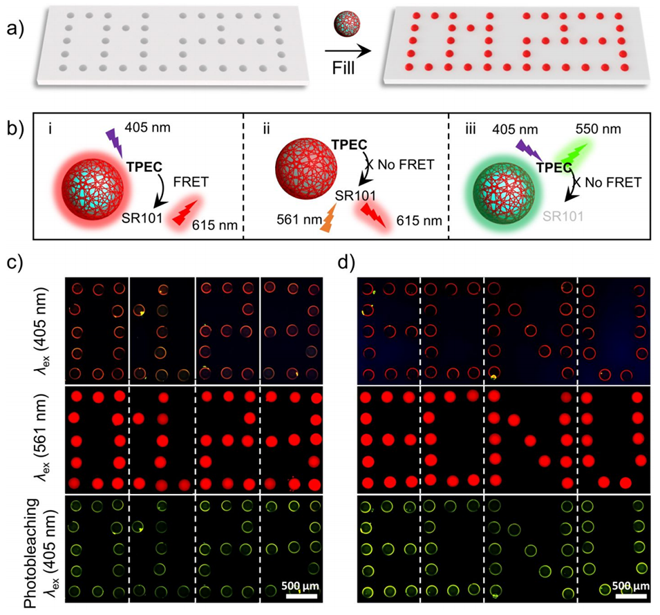 图6. (a) 微胶囊阵列的制备过程示意图;(b) 负载SR101的微胶囊的荧光响应行为:ⅰ 405 nm激发下的荧光行为、ⅱ 561 nm激发下的荧光行为、ⅲ 405 nm激光照射10分钟后405 nm激发下的荧光行为;(c-d) 排列成数字和字母的微胶囊阵列荧光显微镜图像:上排为405 nm激发、中排为561 nm激发、下排为光漂白后405 nm激发。