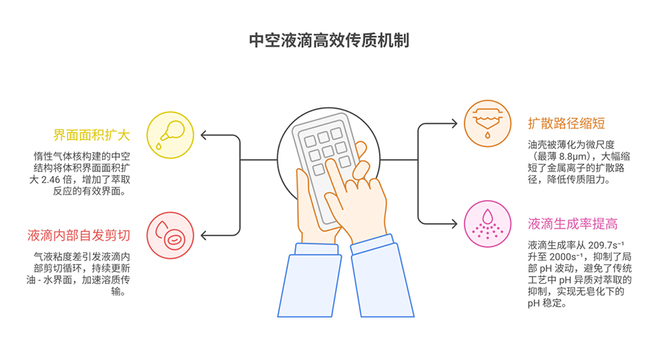 5、该技术通过纯物理手段实现萃取强化,减少了废溶剂产生,兼具高效性、环境友好性与可扩展性,为下一代锂离子电池正极金属回收提供了新型微流控平台,突破了传统湿法冶金的技术瓶颈。