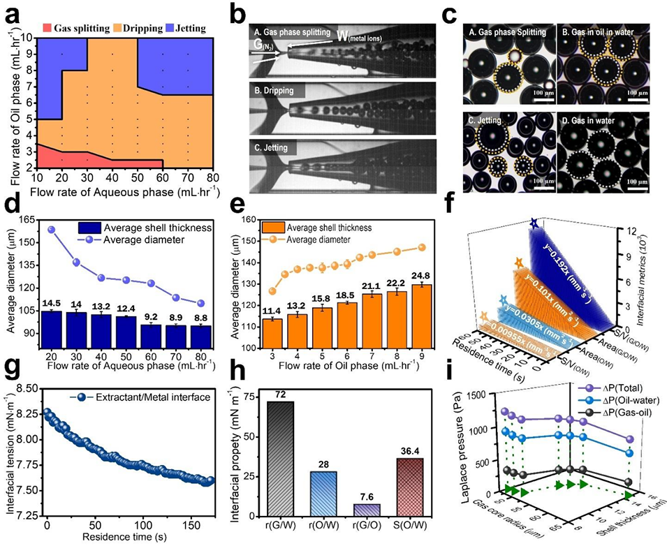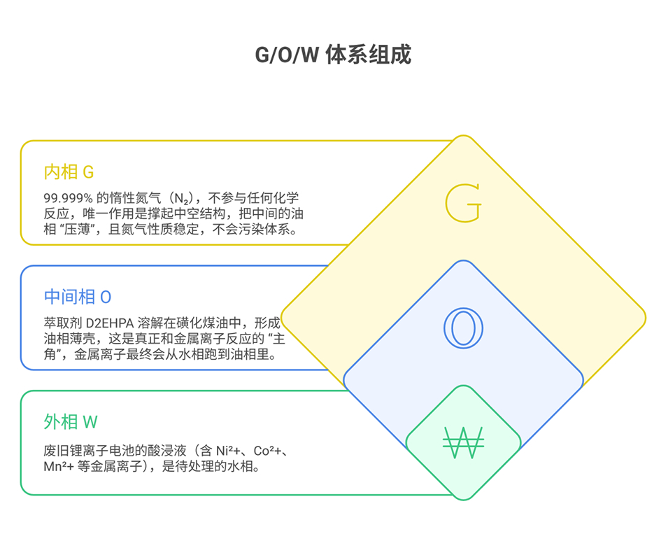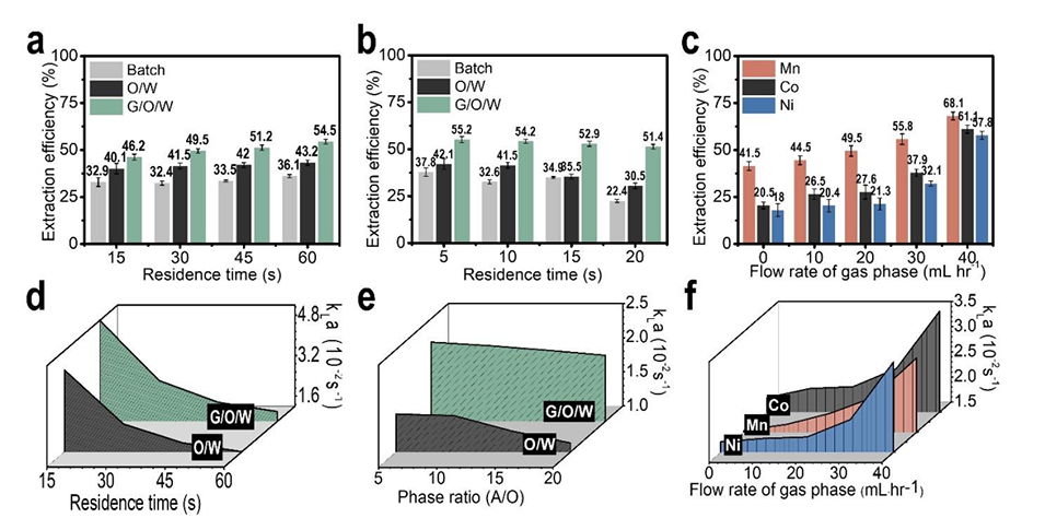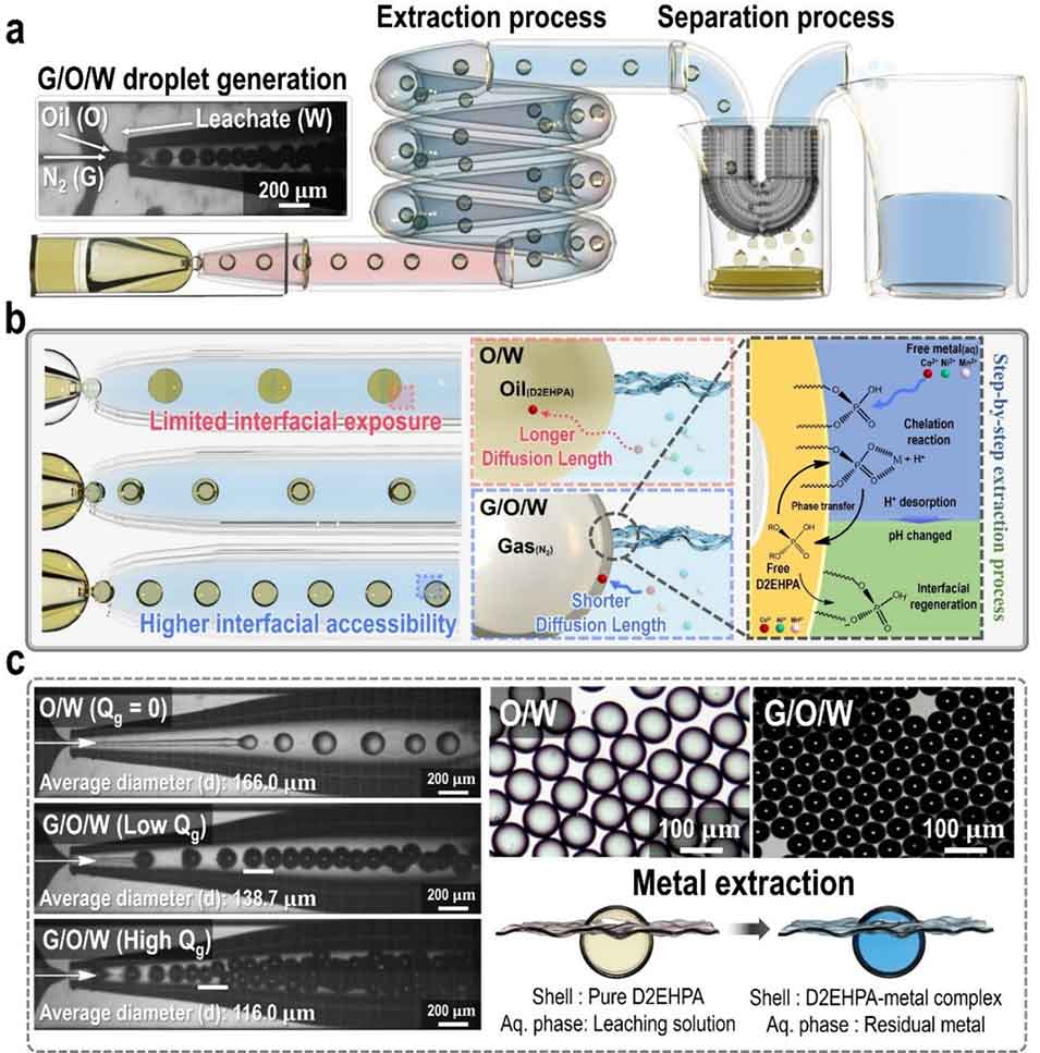 1、该研究开发了一种水包油包气(G/O/W)微流控萃取技术,用于锂离子电池(LIBs)正极金属(Ni、Co、Mn)的高效回收,其核心是通过气相诱导构建特殊界面结构,在无皂化、低相比条件下实现传质强化,解决传统液液萃取传质受限、溶剂消耗大、需化学皂化的问题。