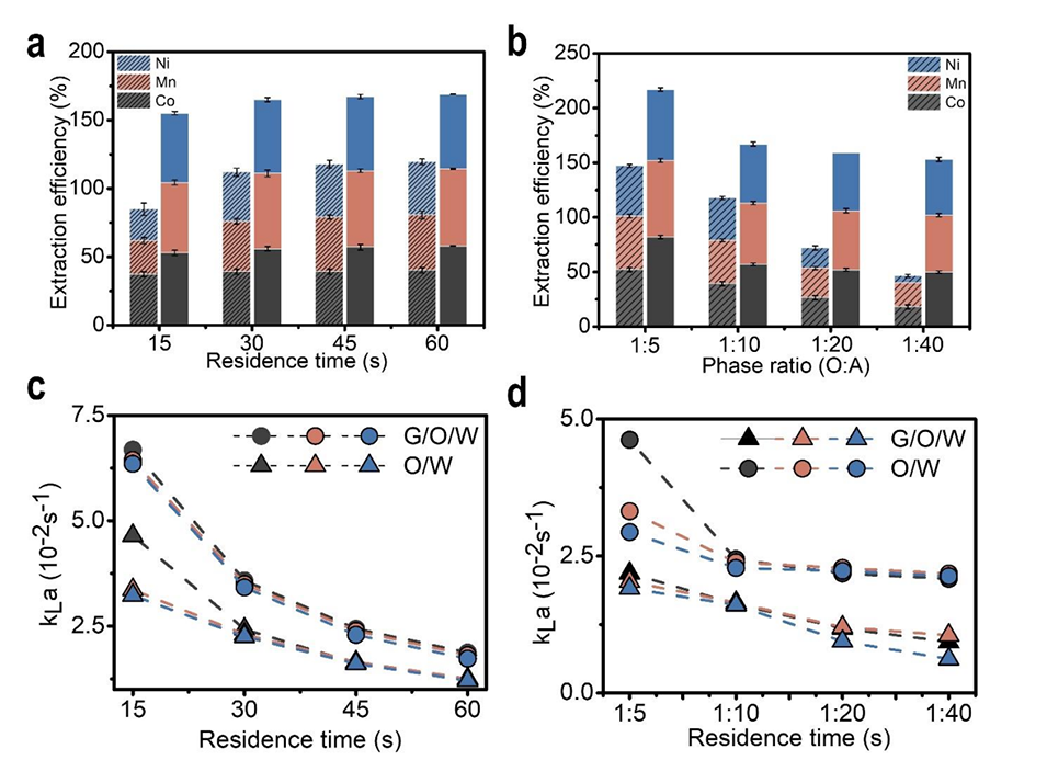 近期,成均馆大学研究团队开发出一种水包油包气(G/O/W)微流控萃取技术,用于废旧锂离子电池(LIBs)正极中Ni、Co、Mn金属的高效回收。该策略通过物理强化传质实现无皂化、低相比下的高萃取效率,解决了传统湿法冶金萃取的传质受限、溶剂消耗大、皂化带来的下游问题等痛点,为LIBs回收提供了环保且可规模化的新方案。相关研究以“Unsaponified high efficiency extraction for cathode metal recycling at low phase ratios using a gas-in-oil-in-water (G/O/W) microfluidic extractor”为题目,发表在期刊《Separation and Purification Technology》上。