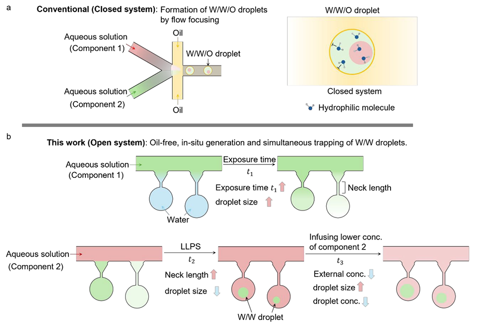 图1. 传统封闭式油包水包水(W/W/O)微流控液滴体系与本研究开放式水包水(W/W)液滴体系的对比。a 传统 W/W/O 液滴的形成依赖于流动聚焦过程中的剪切力,该体系具有高界面张力(γw/o);W/W/O 液滴为封闭体系,液滴与周围油相间的分子交换受到限制。b 本研究无油平台的原理示意图:聚合物浓度梯度驱动溶质向死端腔室迁移,无需外力或表面活性剂,通过双水相体系(ATPS)相分离在原位生成 W/W 液滴。该体系能以高稳定性实现液滴尺寸和浓度的可调调控,且不受主通道流速的影响。与组分 1 的接触时间(t1)越长,生成的液滴越大;连接颈的长度越长,液滴则越小;此外,液滴浓度由其与主通道中组分 2 的平衡状态决定。例如,在平衡状态(t3)后通入更低浓度的组分 2,会生成浓度更低、体积更大的液滴。
