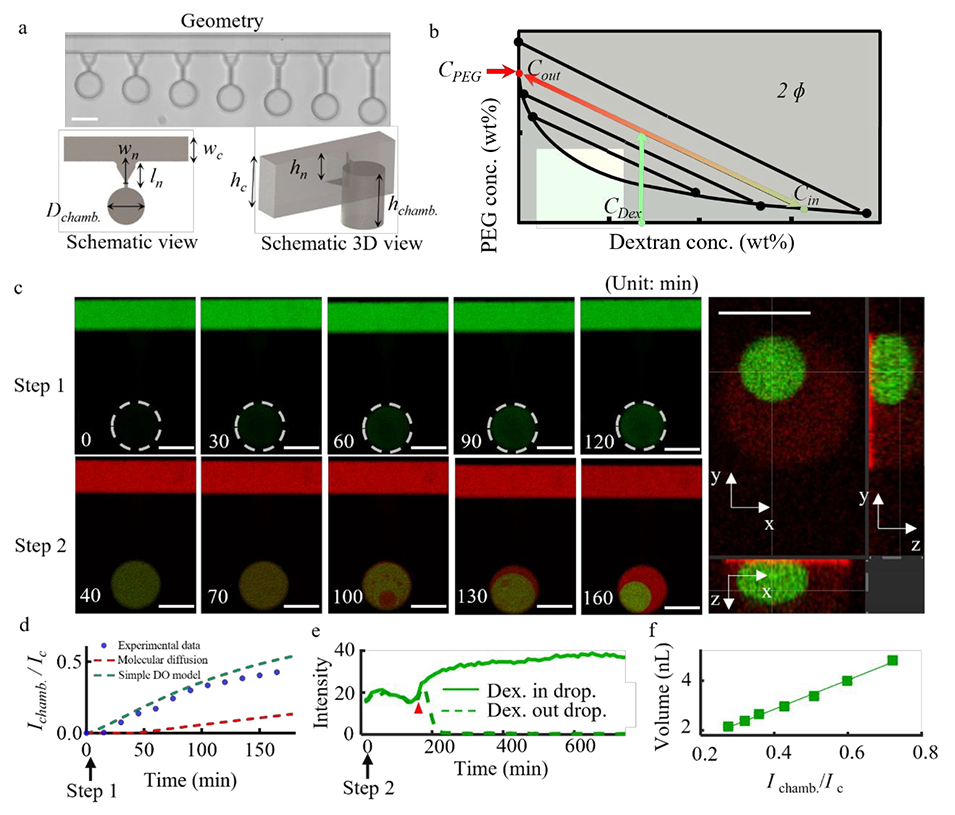图2. 死端腔室微流控器件中,通过液-液相分离(LLPS)生成并捕获葡聚糖液滴。a 带死端腔室的微流控芯片设计参数:通道宽度wc=200 μm、通道高度hc=400 μm、腔室直径Dchamber=300 μm、腔室高度hchamber=400 μm;连接颈的尺寸(宽度wn、长度ln)可调节,宽度范围为 30~90μm,长度范围为 60~360μm。比例尺:300μm。b 聚乙二醇-葡聚糖双水相体系的典型相图。c 死端腔室中液-液相分离的分步过程:步骤 1,葡聚糖溶液(绿色,经异硫氰酸荧光素标记的葡聚糖标记)向死端腔室的扩散过程可视化,主通道持续通液以维持通道内葡聚糖浓度恒定;步骤 2,注入聚乙二醇溶液(红色,经罗丹明标记的聚乙二醇标记),其向死端腔室扩散后触发相分离。右侧图:通过共聚焦显微镜在 xy、xz、yz 三个平面的切片成像,呈现生成的葡聚糖液滴的三维形态,该腔室的连接颈宽度为wn=30 μm。比例尺:200μm。d 向微流控芯片中通入 10 wt% 的葡聚糖溶液时,腔室内(ln=210 μm、wn=30 μm)葡聚糖相对浓度随接触时间变化的实验数据(蓝点)和数值模型拟合结果(红色虚线:扩散模型;绿色虚线:扩散渗透模型)。Ic 为主通道荧光强度,Ichamber 为腔室荧光强度。e 生成过程中,液滴内外葡聚糖浓度随时间的变化,箭头指示液-液相分离的起始时刻。f 液滴体积与捕获腔室内葡聚糖相对荧光强度的相关性。