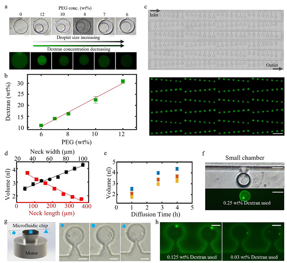 以研究最成熟的聚乙二醇(PEG)- 葡聚糖水相双相体系为模型,团队实现了液滴尺寸和浓度的独立精准调控:通过改变连接颈的几何结构、葡聚糖溶液的暴露时间调控液滴尺寸,通过改变主通道 PEG 溶液浓度调控液滴内葡聚糖浓度。