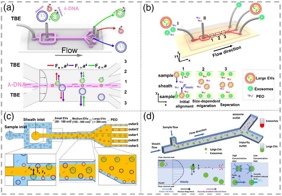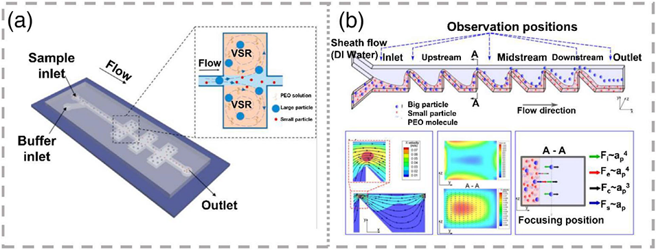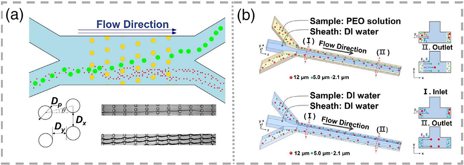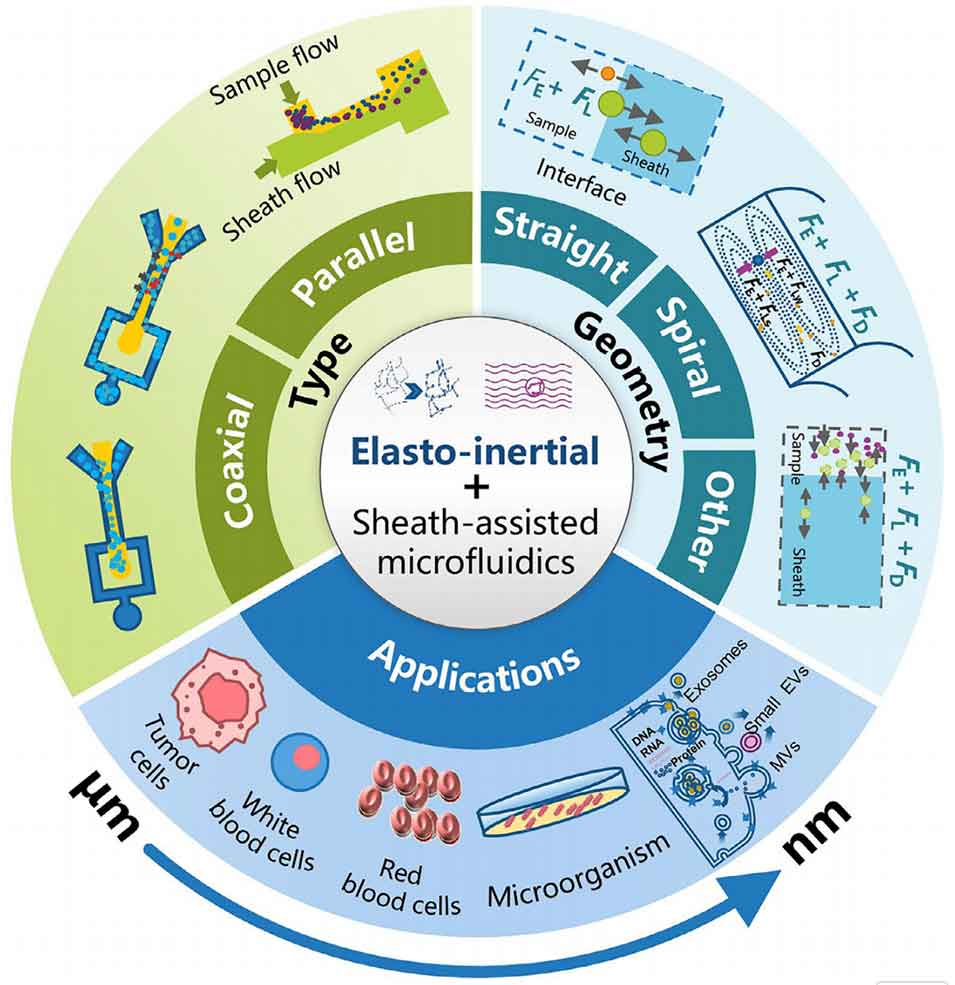 生物颗粒操控对于诊断学、治疗学及生物学研究至关重要。微流控技术具备高通量与精准调控的优势,但传统牛顿流体相关方法面临高流速导致细胞损伤、亚微米颗粒分选效率低下等挑战。为解决这些局限,粘弹性流体的引入实现了无需外场的尺寸依赖性颗粒分选。然而,单一粘弹性流动系统因存在聚焦稳定性差、复杂生物样本适配性不足、跨尺度分选效率低等问题,难以满足临床级生物颗粒操控需求。为克服上述难题,研究人员采用鞘流辅助策略,通过多流层流机制调控流体界面。在此过程中,鞘流辅助弹性惯性效应可压缩颗粒迁移路径,提升微/纳米级颗粒操控效率。