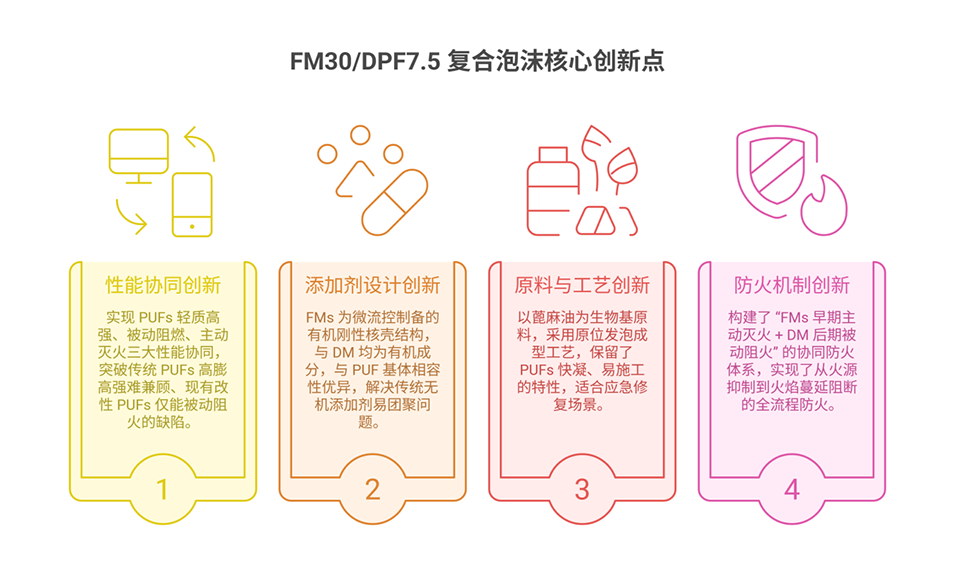 1、该研究针对传统聚氨酯泡沫(PUFs)力学性能低、防火性差且难以兼顾高膨胀比与高强度的问题,开发了一种可原位制备、兼具轻质高强、被动阻燃和主动灭火性能的刚性聚氨酯泡沫复合材料 FM30/DPF7.5,为应急修复和建筑领域提供了新型材料方案。
