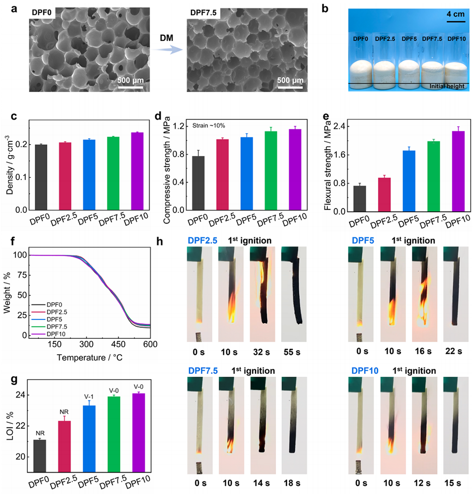 图2. (a) DPF0与DPF7.5的SEM图像;(b) DPFx系列材料的实物照片;(c) 密度、(d) 抗压强度、(e) 抗弯强度、(f) 热重(TG)曲线、(g) 极限氧指数(LOI);(h) DPFx系列材料垂直燃烧试验的实物照片