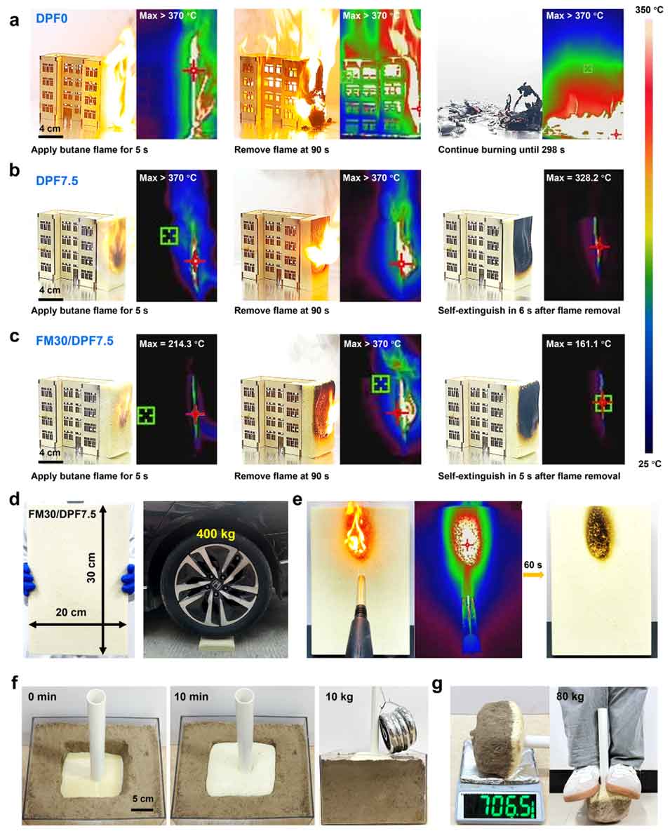 图4. (a-c) 分别由DPF0、DPF7.5、FM30/DPF7.5防护的建筑模型在丁烷火焰下灼烧90s的实物照片,及模型侧面随时间变化的红外热成像图;(d) 大尺寸FM30/DPF7.5承载400kg重物的实物照片;(e) 大尺寸FM30/DPF7.5经丁烷火焰灼烧60 s的点燃过程实物照片(左)、对应红外热成像图(中),及灼烧60s后的实物照片(右);(f) FM30/DPF7.5的原位成型效果演示实物照片;(g) 展示FM30/DPF7.5质量与力学强度的实物照片