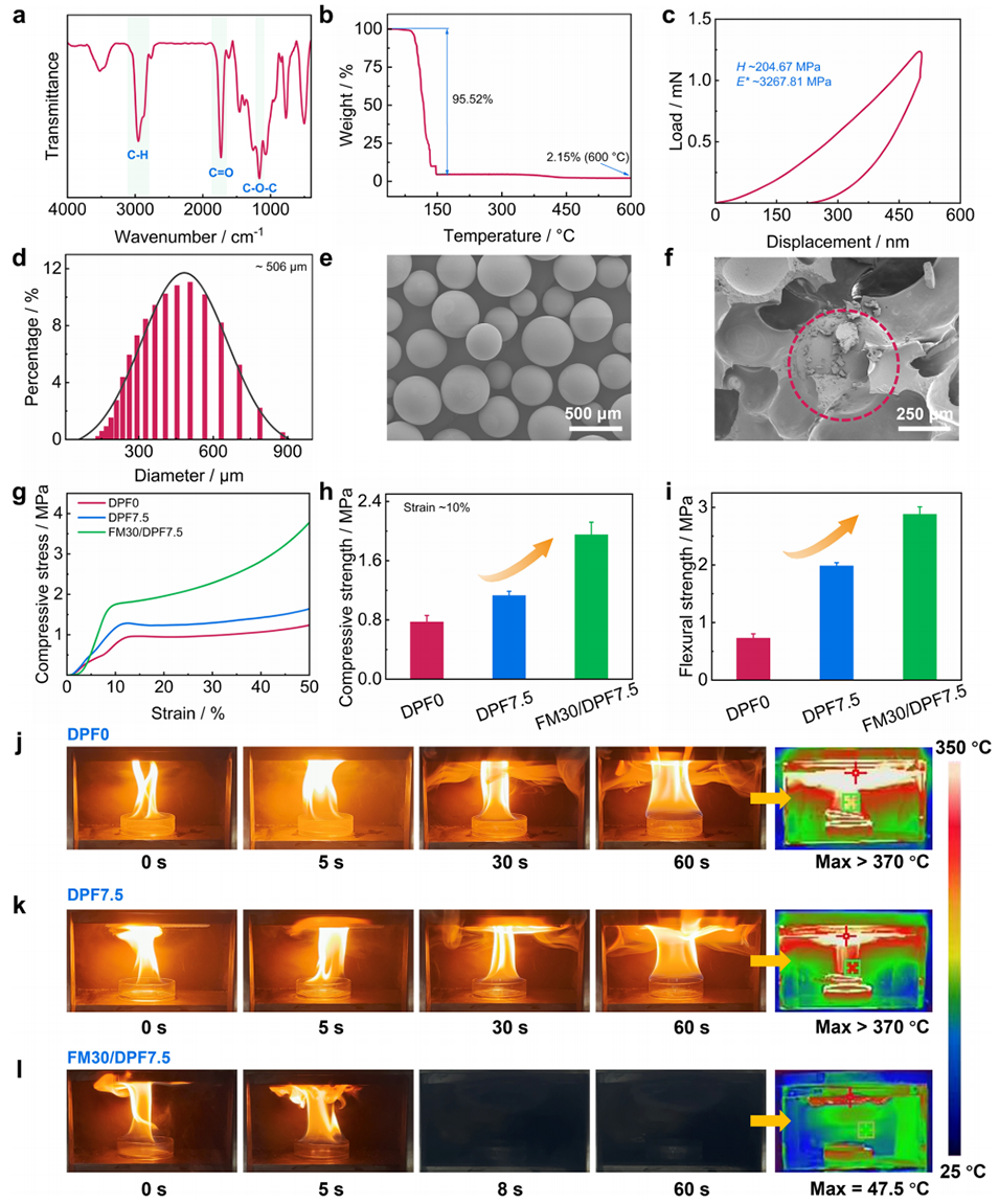 图3. (a) FMs的傅里叶变换红外光谱(FTIR)图、(b) 热重(TG)曲线、(c) 载荷-位移曲线、(d) 粒径分布、(e) SEM图像;(f) FM30/DPF7.5的SEM图像;(g) 抗压应力-应变曲线、(h) 抗压强度、(i) 抗弯强度(测试样品为DPF0、DPF7.5、FM30/DPF7.5);(j- l) DPF0、DPF7.5、FM30/DPF7.5的灭火演示实物照片