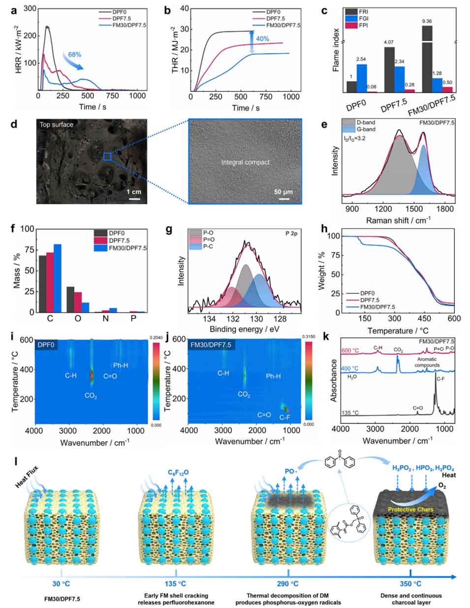 图5. (a) 热释放速率(HRR)曲线、(b) 总热释放量(THR)曲线、(c) 火灾参数(测试样品为DPF0、DPF7.5、FM30/DPF7.5);(d) FM30/DPF7.5经锥形量热仪测试后,其残炭顶面的实物照片与SEM图像;(e) 该残炭顶面的拉曼光谱图;(f) DPF0、DPF7.5、FM30/DPF7.5残炭的元素组成(碳、氧、氮、磷);(g) FM30/DPF7.5残炭的P 2p光电子能谱图;(h) DPF0、DPF7.5、FM30/DPF7.5的热重(TG)曲线;(i) DPF0、(j) FM30/DPF7.5在氮气氛围下分解产物的三维热重-红外(TG–IR)光谱图;(k) FM30/DPF7.5在氮气氛围下不同时间分解产物的傅里叶变换红外光谱(FTIR)图;(l) 聚氨酯泡沫中磷系阻燃剂DM与灭火微胶囊FMs实现高效防火的作用机制示意图