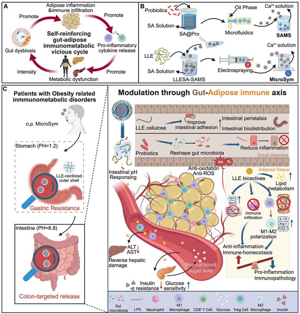 越来越多的研究证实,肥胖本质上是一种慢性免疫代谢疾病,其发生发展与肠道菌群失衡及肠道-脂肪通讯紊乱密切相关。近期,香港都会大学联合武汉体育学院、南京大学等多所院校的研究人员,开发出一种生物工程化pH响应性益生菌-益生元层级微球(MicroSym),该微球以微流控辅助相分离结合静电喷雾技术制备,通过核壳结构实现益生菌与荷叶源益生元的共载共递送,可精准调控菌群-免疫-代谢的相互作用,为肥胖相关免疫代谢疾病提供了兼具靶向性与转化潜力的新型治疗策略。相关研究以“Bioengineered Probiotic‐Prebiotic Hierarchical Microspheres With pH‐Responsive Architecture Reprogram Immunometabolism in Obesity‐Related Disorders”为题目,发表在期刊《Small》上。