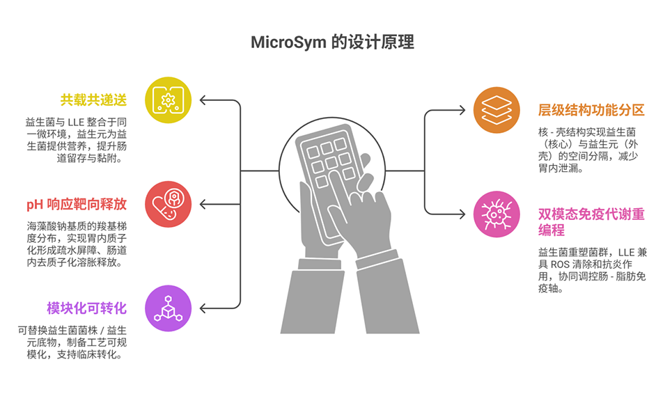 1、该研究开发了一种pH响应性益生菌-益生元层级微球(MicroSym),旨在通过重塑肠道菌群、调控免疫代谢来治疗肥胖相关免疫代谢疾病,解决传统益生菌/益生元疗法胃部存活率低、肠道递送效率不足等关键问题。