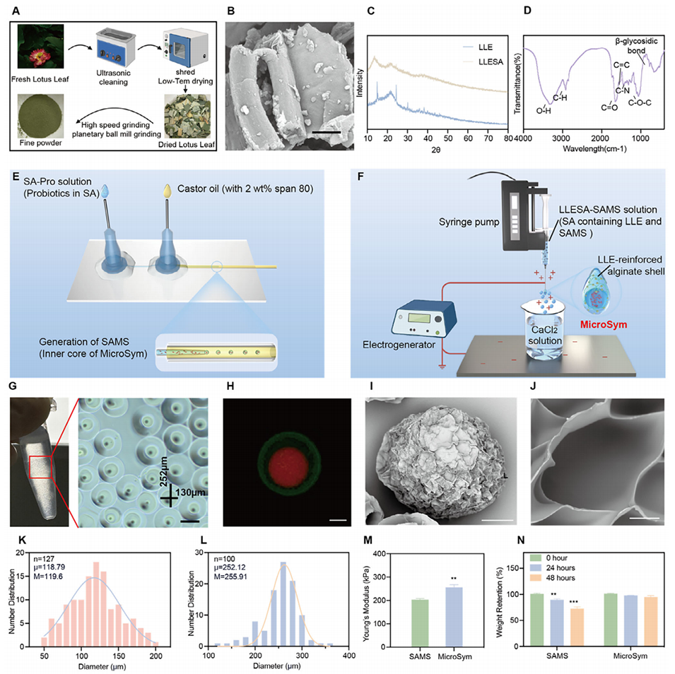 2、以微流控相分离结合静电喷雾技术构建核-壳结构,核内包封益生菌,外壳整合荷叶来源益生元(LLE);海藻酸盐基质的羧基梯度分布赋予其pH响应性,胃酸中形成疏水屏障保护益生菌,肠道中性环境中溶胀释放活性成分,且LLE增强了微球的机械稳定性与生物相容性。