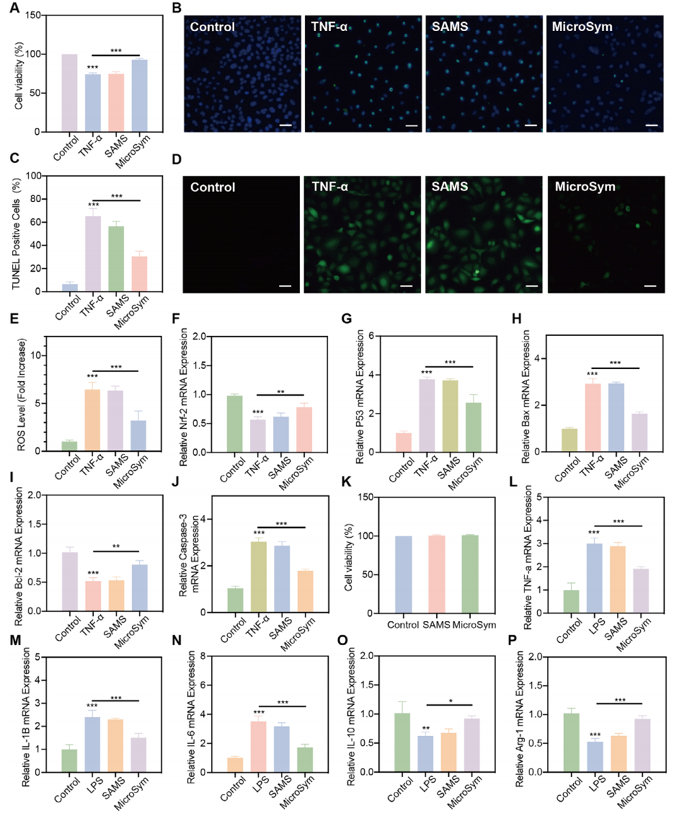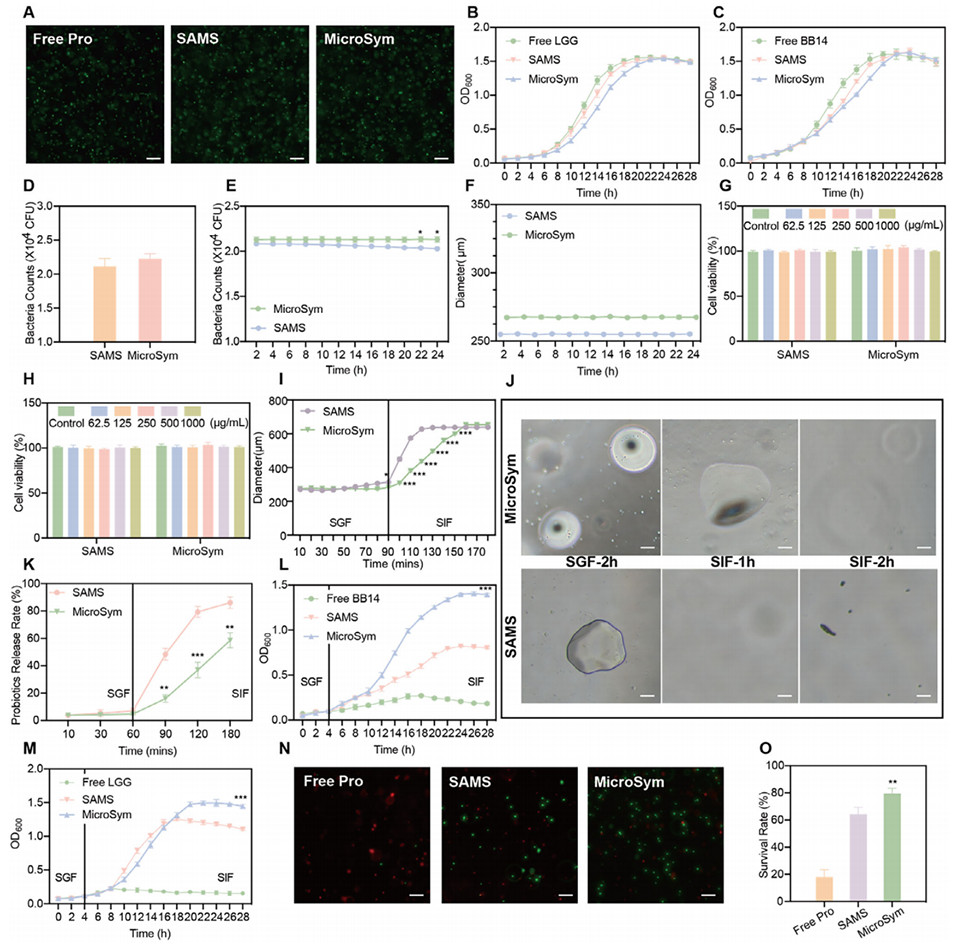 3、MicroSym无细胞毒性,能显著提升益生菌在模拟胃肠环境中的存活率(达79.4%),实现益生菌的肠道缓慢释放;同时LLE富含多酚、黄酮等活性物质,使微球具备抗氧化、抗凋亡作用,还能调控巨噬细胞从促炎M1型向抗炎M2型极化,减轻肠道炎症。