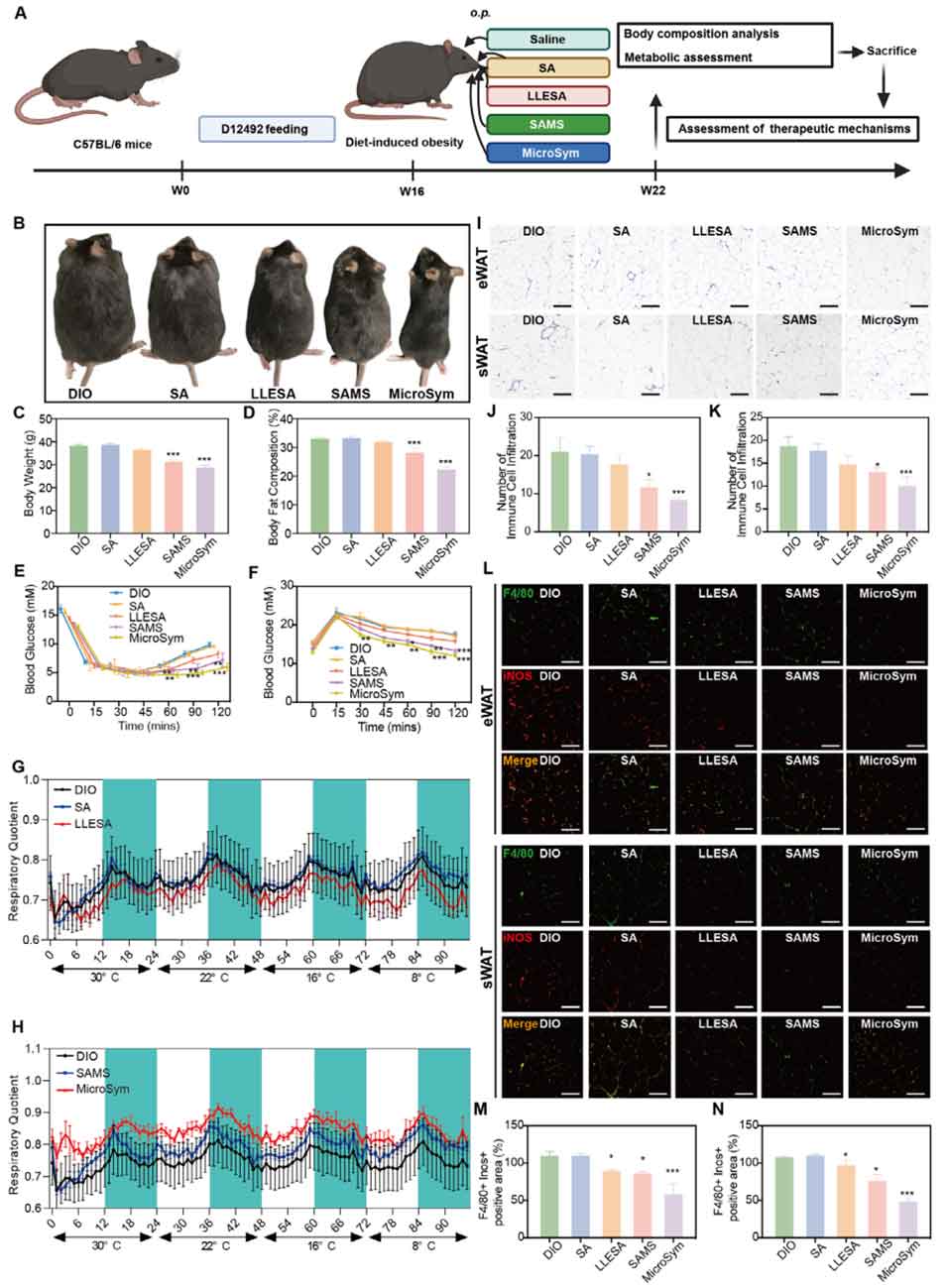 4、在饮食诱导的肥胖(DIO)小鼠模型中,MicroSym可在胃肠道持续留存并黏附肠黏膜,有效重塑肠道菌群结构、提升菌群多样性;干预后小鼠体重降低25.2%、脂肪量显著减少,葡萄糖耐受和胰岛素敏感性改善,脂代谢与激素水平恢复正常。