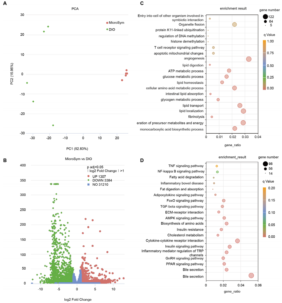 5、MicroSym通过破坏“肠道菌群失调→肠-脂肪轴炎症→代谢紊乱”的恶性循环发挥作用,一方面修复肠道屏障、调节肠道免疫,另一方面抑制脂肪组织的促炎细胞浸润与M1巨噬细胞极化,上调抗炎因子表达;转录组分析证实其可激活脂肪分解、胰岛素信号通路,抑制TNF/NF-κB等炎症通路,实现免疫代谢的系统性重编程。