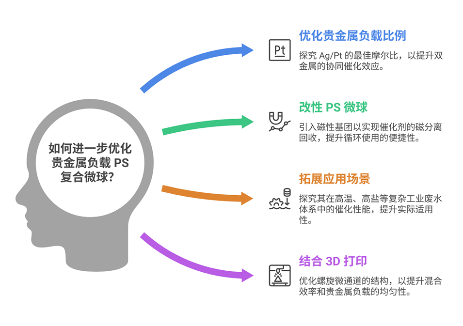 3、随后设计螺旋微通道反应器,通过一步连续流法,在数分钟内将 Ag 单金属及 Ag-Pt、Ag-Au 双金属纳米颗粒原位负载于不同形貌 PS 微球上,提出吸附-还原-渗透机制阐明负载过程;该方法解决了传统制备中步骤繁琐、耗时、纳米颗粒团聚的问题,且开孔型 PS 微球的 Ag、Pt 负载量分别达 7% 和 10%。