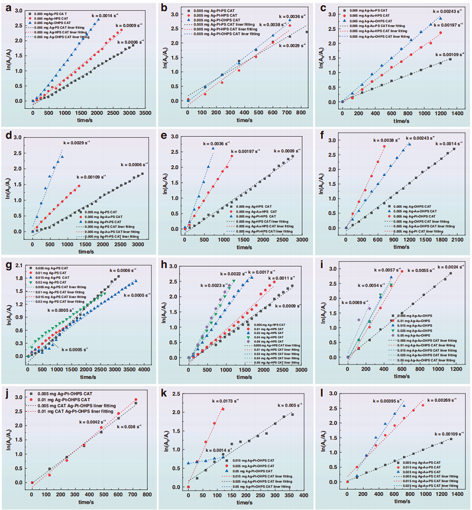 4、以 NaBH₄为还原剂,将制备的复合微球用于 4-NP 还原为 4 - 氨基苯酚(4-AP)的催化反应,系统探究了载体形貌、催化剂用量、贵金属类型对催化性能的影响。结果表明,催化反应符合一级动力学,开孔型 PS 微球负载 Ag-Pt 双金属纳米颗粒(Ag-Pt@OHPS) 表现出最优催化性能,反应速率常数达 1.73×10⁻² s⁻¹,活性参数为 692 s⁻¹・g⁻¹,且经 5 次循环使用后催化活性无明显下降,稳定性优异。其高效催化源于开孔结构的大比表面积、丰富的活性位点,以及 Ag 与 Pt 的协同作用(Pt 产生活性氢并溢流,Ag 高效吸附 4-NP)。