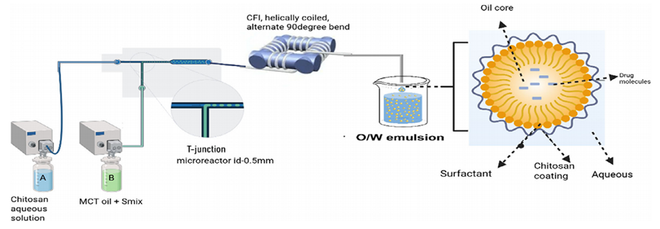 图1. 微流体辅助自发乳化法制备壳聚糖包被的褪黑素载NE的示意图
