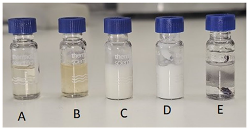 图5. 三元配方体系中观察到的代表性物相状态:(A)各向同性液体;(B)透明凝胶;(C)乳白色凝胶;(D)稳定乳剂;(E)双相体系。