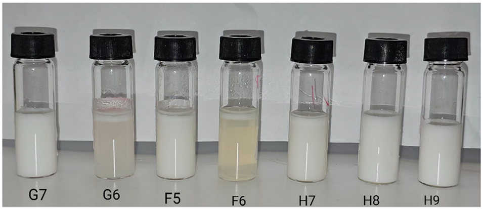 图6. 经6次冻融循环和冷热循环后,所选纳米乳剂配方的热力学稳定性测试结果。配方H8和H9仍保持均一单相,无可见乳析现象。