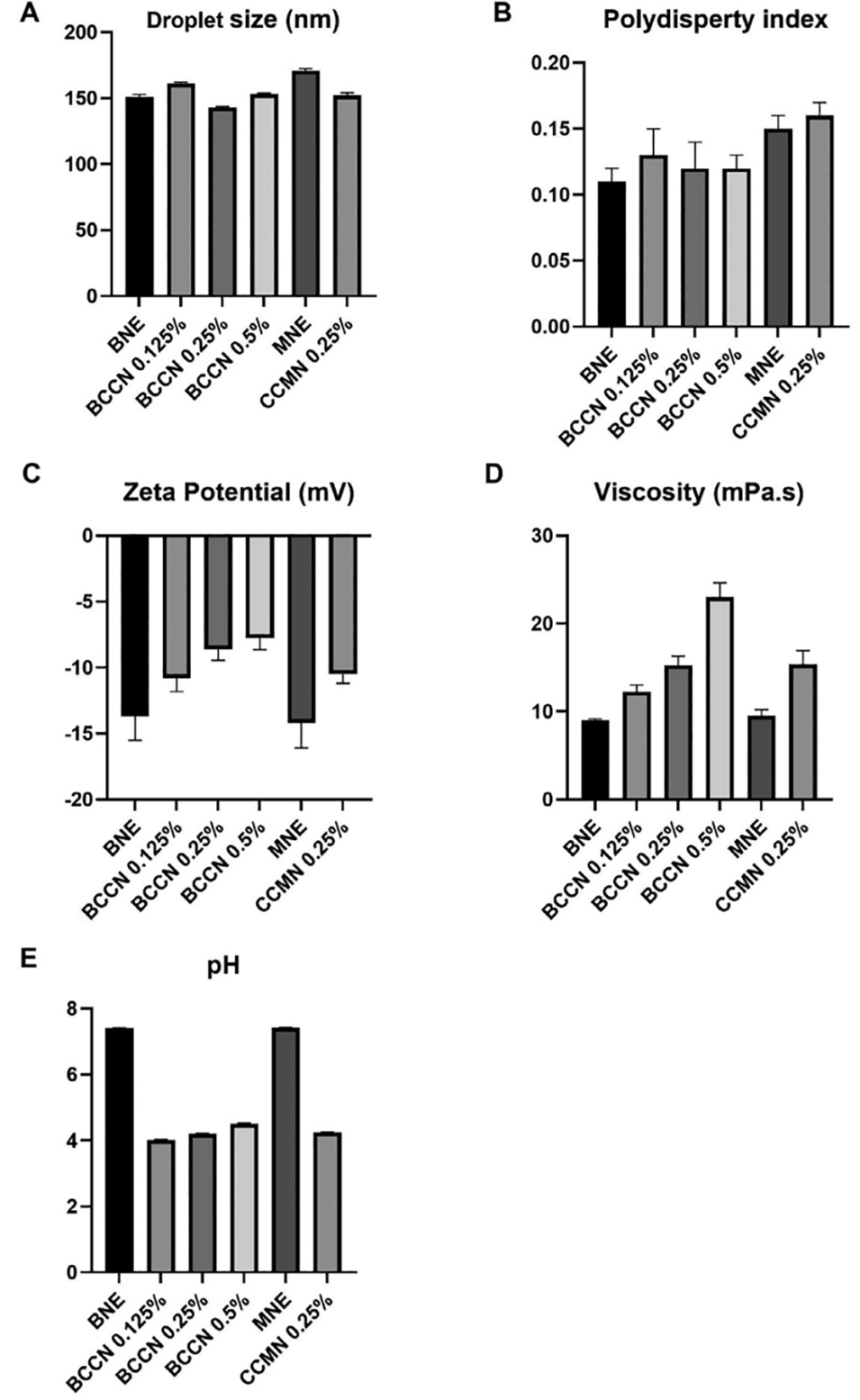 图7. 空白纳米乳剂、褪黑素载药纳米乳剂及壳聚糖包覆褪黑素纳米乳剂的理化性质表征(平均值±标准差,n=9):(a)平均液滴粒径;(b)25℃下的黏度;(c)多分散指数;(d)zeta电位;(e)pH值。