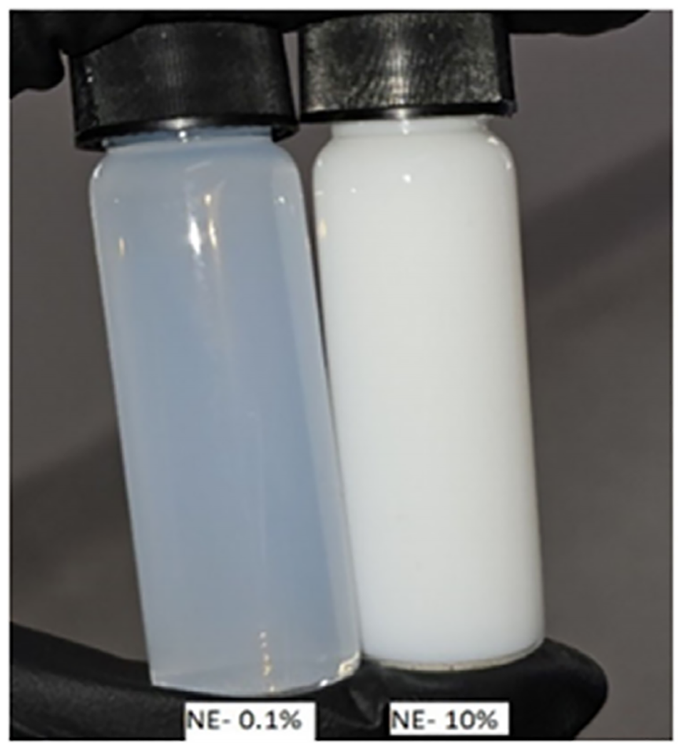 图8. 两种不同油相浓度的水包油型纳米乳剂外观对比。右侧样品管(标注NE–10%)为含10%质量分数油相的纳米乳剂,呈乳白色;左侧样品管(标注NE–0.1%)为含0.1%质量分数油相的纳米乳剂,低油含量下的亚微米液滴使其呈现丁达尔效应。