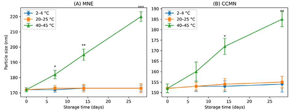 图9. 贮藏温度对褪黑素纳米乳剂液滴粒径稳定性的影响:(A)褪黑素载药纳米乳剂;(B)壳聚糖包覆褪黑素纳米乳剂。制剂分别于2℃~4℃、20℃~25℃、40℃~45℃条件下贮藏28天,数据以平均值±标准差表示(n=3),误差棒代表标准差。采用双因素方差分析结合相应的事后多重比较检验进行统计分析,星号表示同一贮藏时间点下,40℃~45℃条件与低温条件(2℃~4℃、20℃~25℃)相比存在统计学显著差异(*p<0.05;**p<0.01;***p<0.001)。