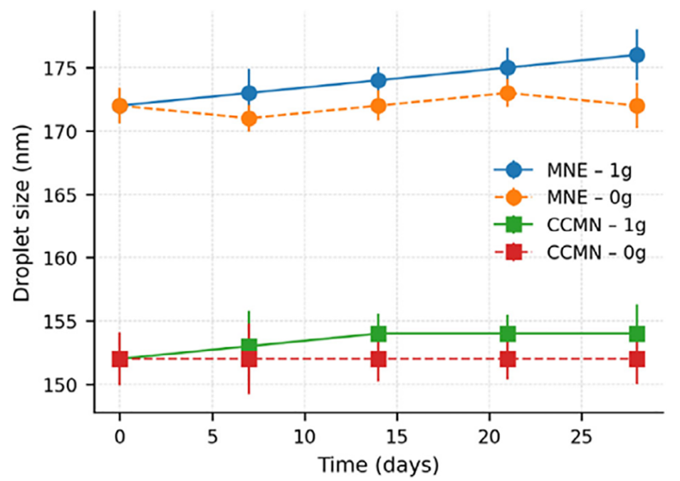 3、在40℃–45℃加速热应力下28天,CCMN的粒径增长远低于MNE(185nm vs 220nm);在随机定位仪模拟的微重力环境中,CCMN可维持粒径和PDI稳定、无聚结,而MNE出现非破坏性的粒径波动,证明壳聚糖包覆显著提升了乳剂在太空模拟环境中的物理稳定性。