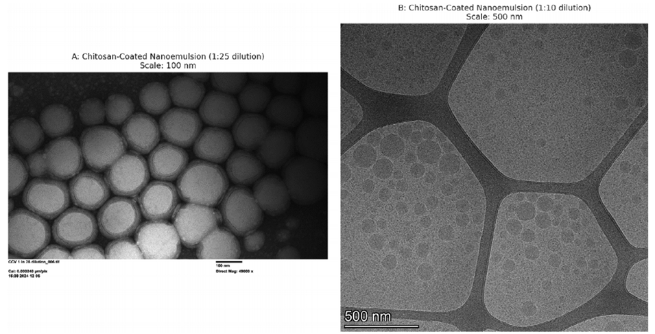 图12. 不同稀释比例下壳聚糖包覆纳米乳剂的冷冻透射电镜显微图像:(A)壳聚糖包覆纳米乳剂,1:25稀释;比例尺=100nm;(B)壳聚糖包覆纳米乳剂,1:10稀释;比例尺=500nm。