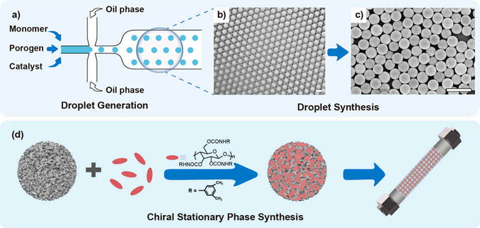 4、该研究证实,液滴微流控精密制备的大孔二氧化硅微球作为手性固定相载体优势显著,其对颗粒形貌和孔结构的精准调控能力,为制备各类高性能手性色谱固定相提供了通用策略,有望推动手性分离技术的发展。