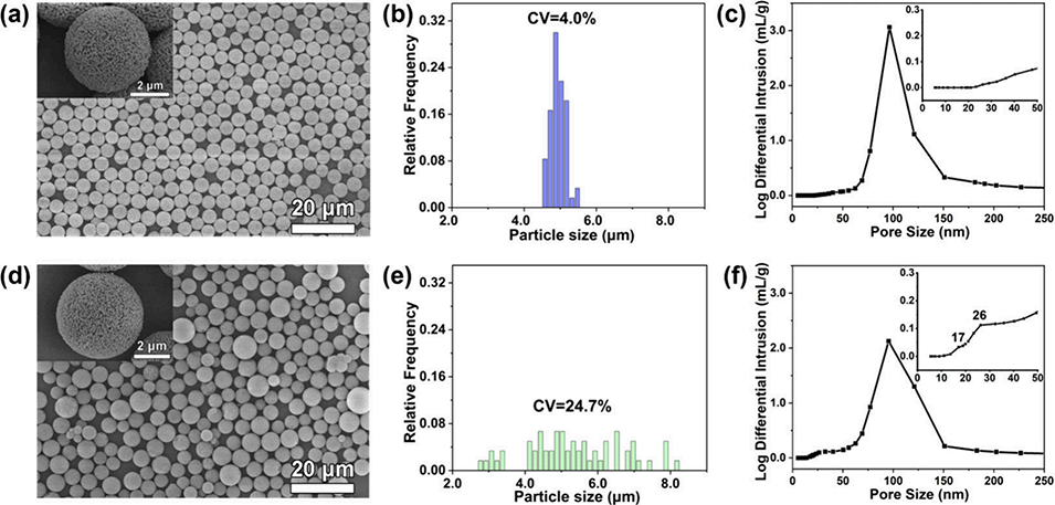 图3 液滴法合成手性固定相(Mono-CSP)与商品化手性固定相(Chiralcel OD-H)的形貌、粒径分布及孔径分布图。Mono-CSP (a) 和 Chiralcel OD-H (d) 的扫描电子显微镜图像,插图为单个大孔二氧化硅微球的放大图;Mono-CSP (b) 和 Chiralcel OD-H (e) 的粒径分布图;Mono-CSP (c) 和 Chiralcel OD-H (f) 的孔径分布图,插图为选定区域内介孔孔径分布的放大图。