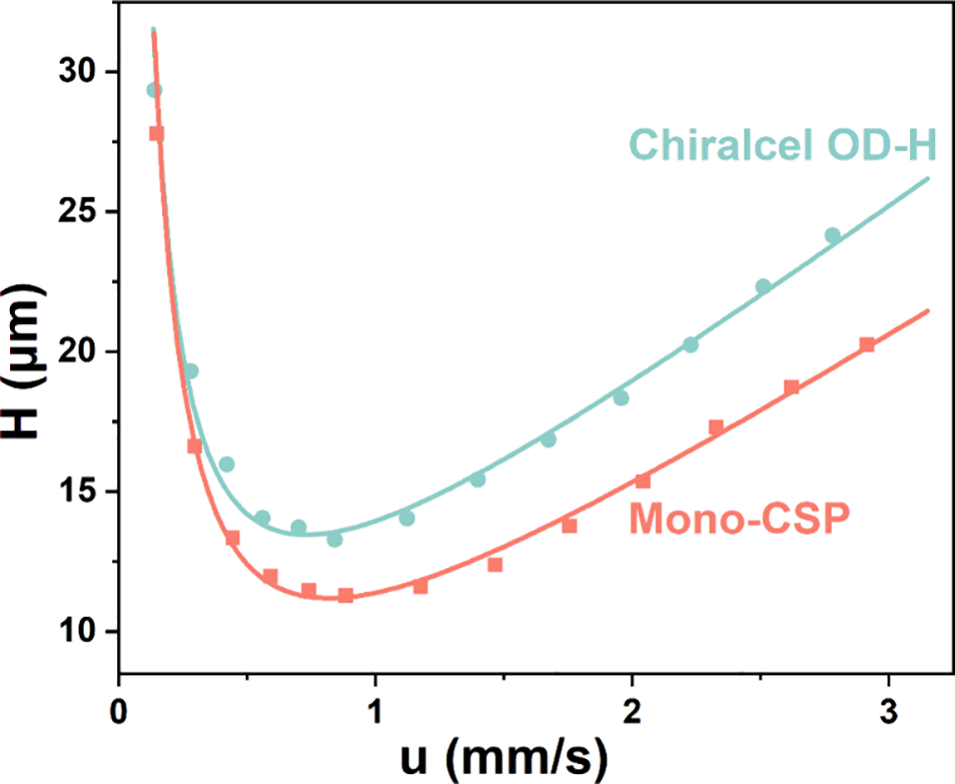 图4 Mono-CSP 色谱柱与 Chiralcel OD-H 色谱柱的范第姆特曲线对比图。