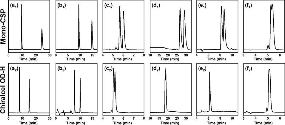 图5 Mono-CSP 色谱柱与 Chiralcel OD-H 色谱柱分离外消旋体的代表性色谱图。