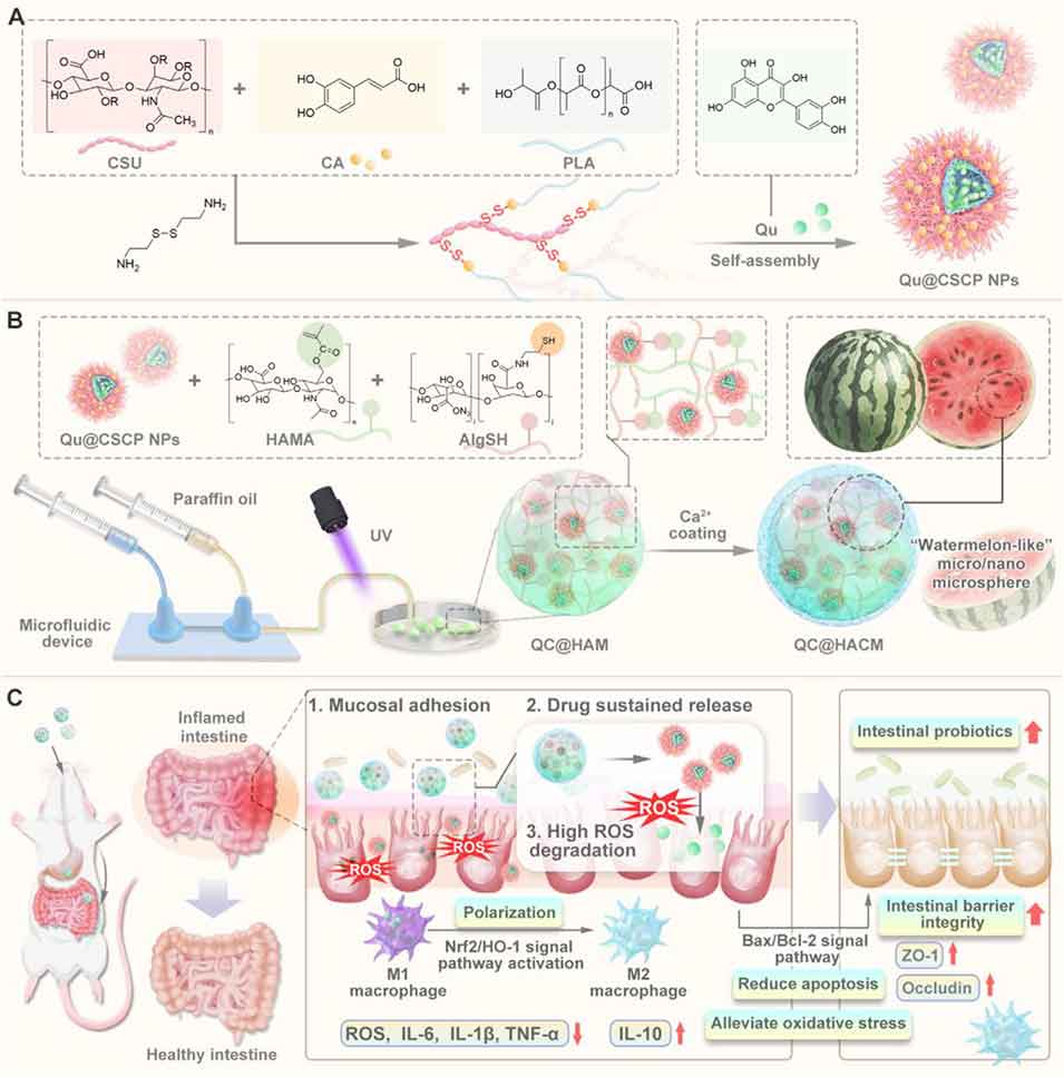 方案1 用于溃疡性结肠炎(UC)联合治疗的 “西瓜样” 分级靶向微球示意图。(A) Qu@CSCP 纳米平台的制备流程;(B) 微/纳复合水凝胶微球(QC@HACM)的制备过程;(C) 口服 QC@HACM 通过清除活性氧、发挥抗炎作用、抑制细胞凋亡、修复肠道屏障功能及调控肠道菌群,实现 UC 靶向治疗的作用机制。