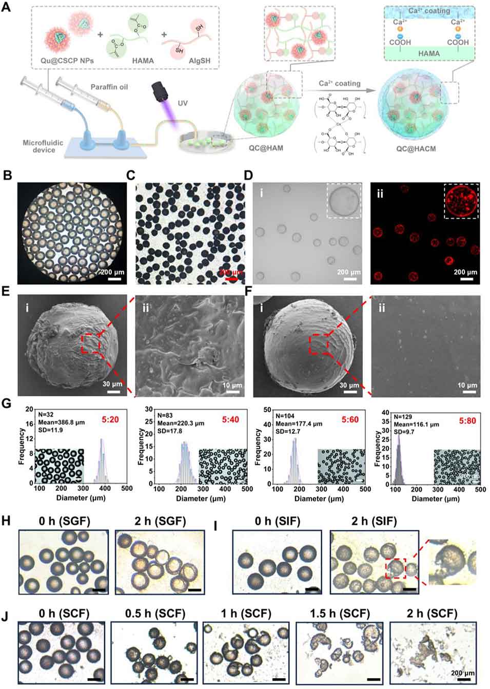 图3 微/纳复合水凝胶微球的制备与表征。(A) QC@HACM 的制备流程示意图;(B) QC@HACM 微球的光学显微镜图像;(C) 凝胶化后 QC@HACM 的显微镜图像;(D) QC@HACM 微球的激光共聚焦扫描显微镜(CLSM)图像;(E,F) 不同放大倍数下 QC@HAM 与 QC@HACM 微球的 SEM 图像,左右图比例尺分别为 30 µm 和 10 µm;(G) 明场显微镜下,不同内/外水相流速制备的 QC@HACM 的粒径统计分布及对应光学图像(n=3);(H-J) QC@HACM 分散于模拟胃液(SGF)(H)、模拟肠液(SIF)(I)、模拟结肠液(SCF)(J) 后的明场显微镜形貌观察结果。