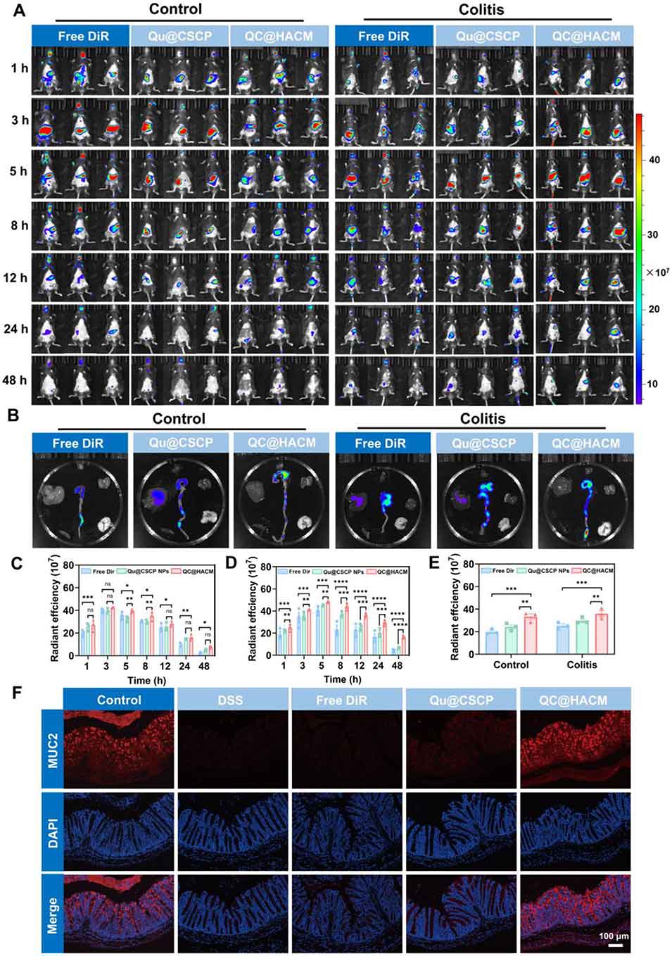 图6 QC@HACM 在炎症结肠中的双靶向与滞留能力。(A) 口服不同制剂后,正常小鼠与 DSS 结肠炎小鼠的时间序列体内荧光成像图;(B) 口服给药 48 h 后,离体结肠与主要脏器的荧光图像;(C) 不同制剂处理后,健康小鼠体内多个时间点的荧光定量检测结果;(D) 口服给药后不同时间点,结肠炎小鼠体内荧光强度的统计直方图;(E) 给药 48 h 后,正常小鼠与结肠炎小鼠结肠内荧光强度的定量分析结果;(F) 不同制剂处理的结肠炎小鼠结肠组织的免疫荧光染色结果。所有数据以均值 ± 标准差表示(n=3);*p<0.05,**p<0.01,***p<0.001,****p<0.0001。