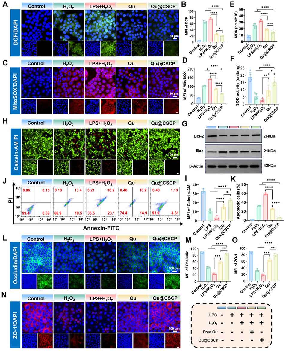 图5 Qu@CSCP 抑制细胞凋亡并促进肠上皮细胞修复。(A,B) 经 LPS 或 LPS+H₂O₂刺激的 Caco-2 细胞,经 DCFH-DA 染色后的代表性荧光图像、及胞内活性氧水平的定量分析结果;(C,D) 相同处理条件下,细胞线粒体超氧阴离子水平的荧光成像及半定量分析结果;(E,F) 不同处理下 Caco-2 细胞中 MDA 含量与 SOD 活性的定量检测结果;(G) 不同组别 Caco-2 细胞中 Bax、Bcl-2 蛋白表达的 WB 分析结果;(H-K) 经 LPS 或 LPS+H₂O₂处理后,Caco-2 细胞的钙黄绿素 - AM/PI(Calcein-AM/PI)活死染色荧光图像、及 Annexin V-FITC/PI 染色的流式细胞术凋亡定量结果;(L-O) 不同处理后 Caco-2 细胞中 Occludin 与 ZO-1 表达的免疫荧光图像及半定量分析结果。所有数据以均值 ± 标准差表示(n=3);*p<0.05,**p<0.01,***p<0.001,****p<0.0001。