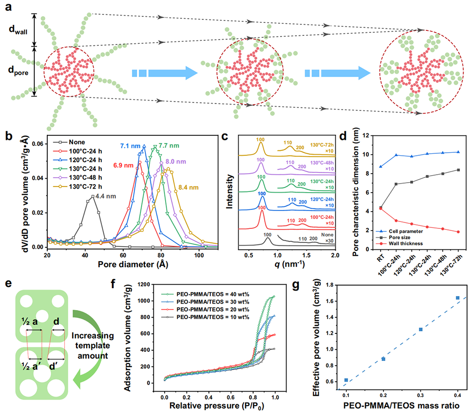 图3 单分散微球中孔结构参数的自由调控。a 通过调控水热条件实现孔结构调控的示意图;b 不同水热条件下有序介孔微球的孔径分布、c 小角 X 射线散射图谱及 d 孔特征尺寸统计;e 通过增加结构导向剂用量实现孔结构调控的示意图;f 不同聚环氧乙烷- 聚甲基丙烯酸甲酯用量为模板制备的有序介孔微球的氮气吸脱附等温线及 g 有效孔体积(有效孔体积为孔径大于 2 nm 的孔的累积体积)。