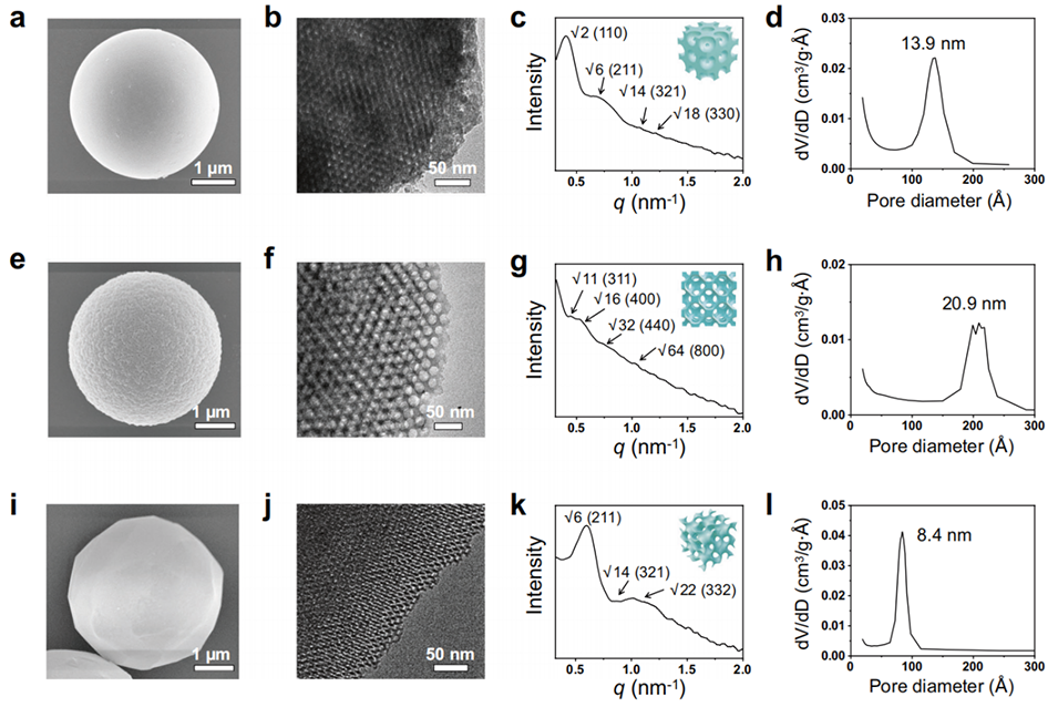 图2 不同孔构型单分散微球的结构表征。a–d 体心立方、e–h 面心立方、i–l 立方双螺旋构型微球的扫描电子显微镜图像、透射电子显微镜图像、小角 X 射线散射图谱及孔径分布。