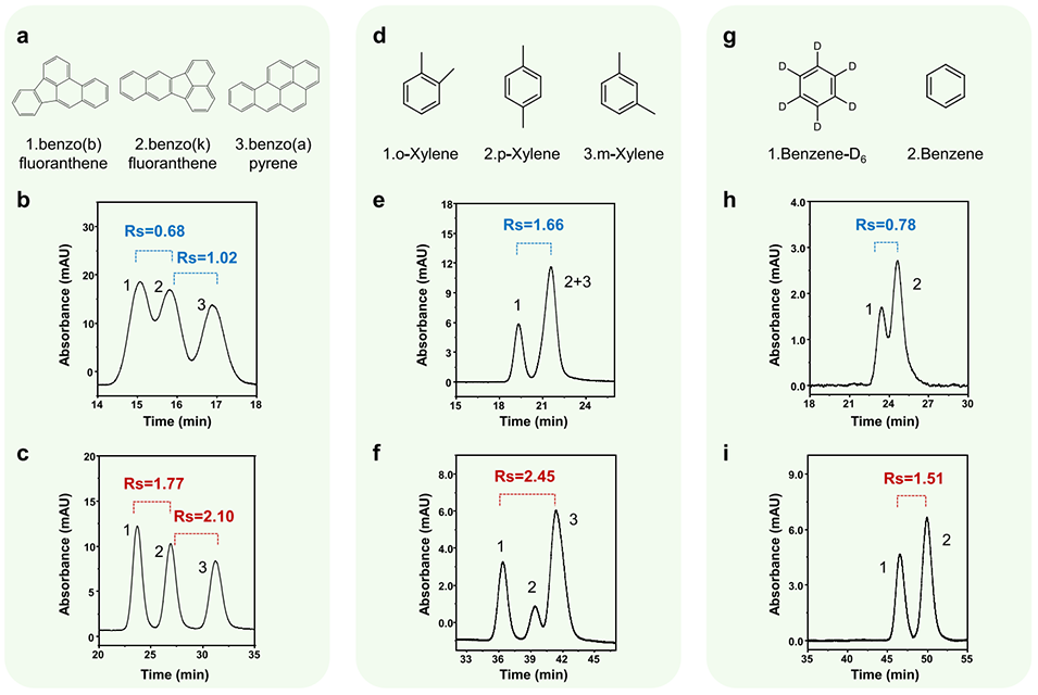 4、在实际分离中,该填料成功解决了经典的“关键物质对”分离难题,对选择性因子 α 趋近于 1 的多环芳烃、二甲苯异构体、苯同位素体等难分离体系,实现了更高的分离度,甚至能在短柱和合理时间内完成传统填料无法实现的基线分离,大幅缩短了分离耗时。