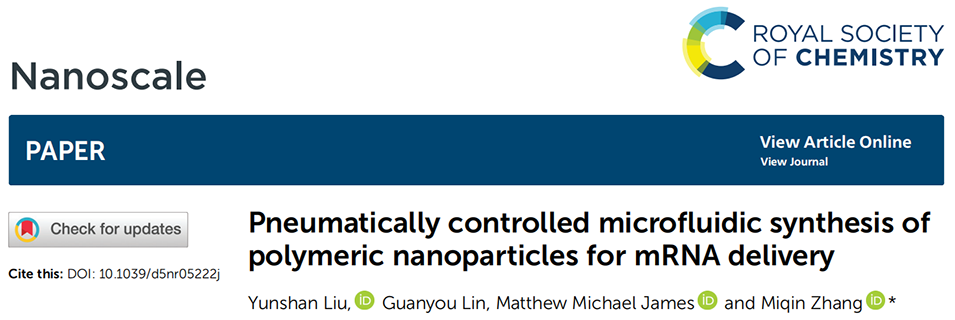 近期,华盛顿大学Miqin Zhang教授团队研发了一款气动控制的微流控平台,可实现mRNA递送用聚合物纳米颗粒的精准、可重复且可规模化合成,解决了传统批量合成粒径分布宽、批次差异大、可扩展性差,以及现有微流控技术易堵塞、内压高、需额外纯化等问题。相关研究以“Pneumatically controlled microfluidic synthesis of polymeric nanoparticles for mRNA delivery”为题目,发表在期刊《Nanoscale》上。