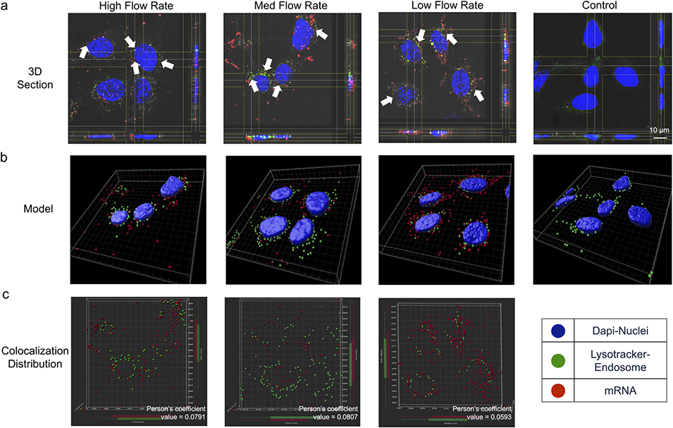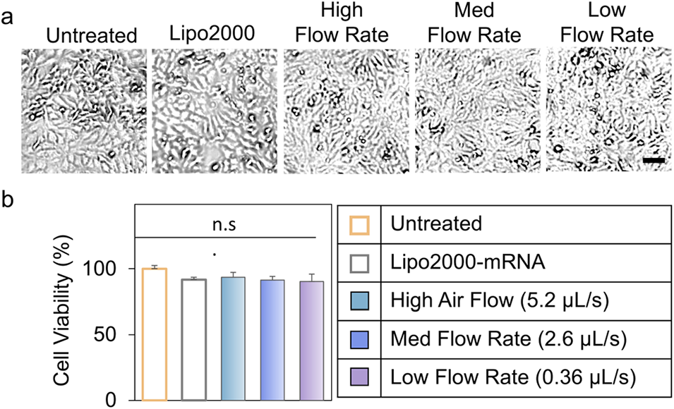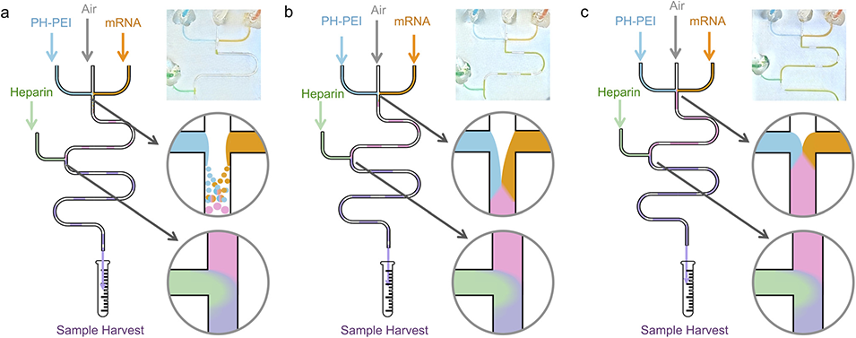 2、通过调节气流速率可精准调控PH-PEI-mRNA-肝素(PPH)纳米颗粒的粒径(90~150nm),且始终保持低多分散性、稳定的ζ电位(约40mV),该平台还能实现一步式PPH复合物组装,合成效率提升50%,并在100余次合成循环中保持批次一致性,规模化生产时仍能维持颗粒均一性,远优于传统批量混合、转子-注射器法。