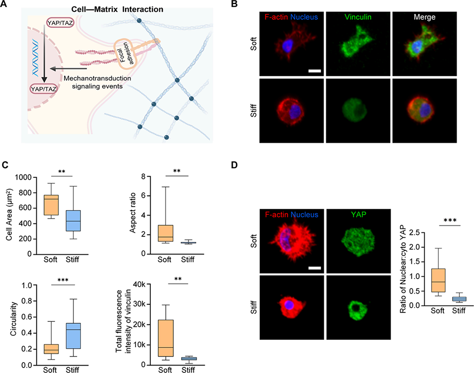 图3. 软质甲基丙烯酰化明胶微球促进包封间充质基质细胞的铺展与机械感知。A)细胞感知甲基丙烯酰化明胶微球的机械信号,触发一系列机械转导信号事件并最终影响 Yes 相关蛋白核转位的示意图;B)包封在不同刚度甲基丙烯酰化明胶微球中间充质基质细胞的 F - 肌动蛋白和纽蛋白代表性荧光图像;C)不同刚度水凝胶微球中间充质基质细胞的铺展面积、长宽比、圆形度及纽蛋白总荧光强度的统计分析(n=15-20);D)水凝胶微球中间充质基质细胞中 Yes 相关蛋白的代表性荧光图像(左)及细胞核/细胞质中 Yes 相关蛋白比值的定量分析(右,n=11)。B、D 比例尺:10μm。