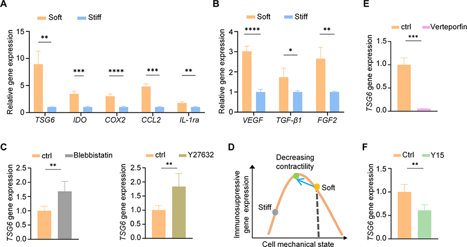 图4. 炎症因子通过调控适宜的细胞骨架张力和 Yes 相关蛋白的核定位,实现对间充质基质细胞的机械敏感激活。A、B)炎症环境下,包封在甲基丙烯酰化明胶微球中的间充质基质细胞其抗炎相关基因(A)和再生相关基因(B)的相对表达量荧光定量 PCR 分析;C)软质水凝胶微球经布雷他汀(左)和 Y27632(右)抑制剂处理后,肿瘤坏死因子刺激基因 6 的表达情况;D)在软质甲基丙烯酰化明胶微球中,利用布雷他汀或 Y27632 抑制剂降低细胞收缩性,可上调免疫抑制相关基因的表达;E、F)软质甲基丙烯酰化明胶微球中的间充质基质细胞在维替泊芬(E)和 Y15(F)抑制剂作用下,肿瘤坏死因子刺激基因 6 的表达情况。A、B、C、E、F 均为 n=4,*p<0.05,**p<0.01,***p<0.001,学生 t 检验。